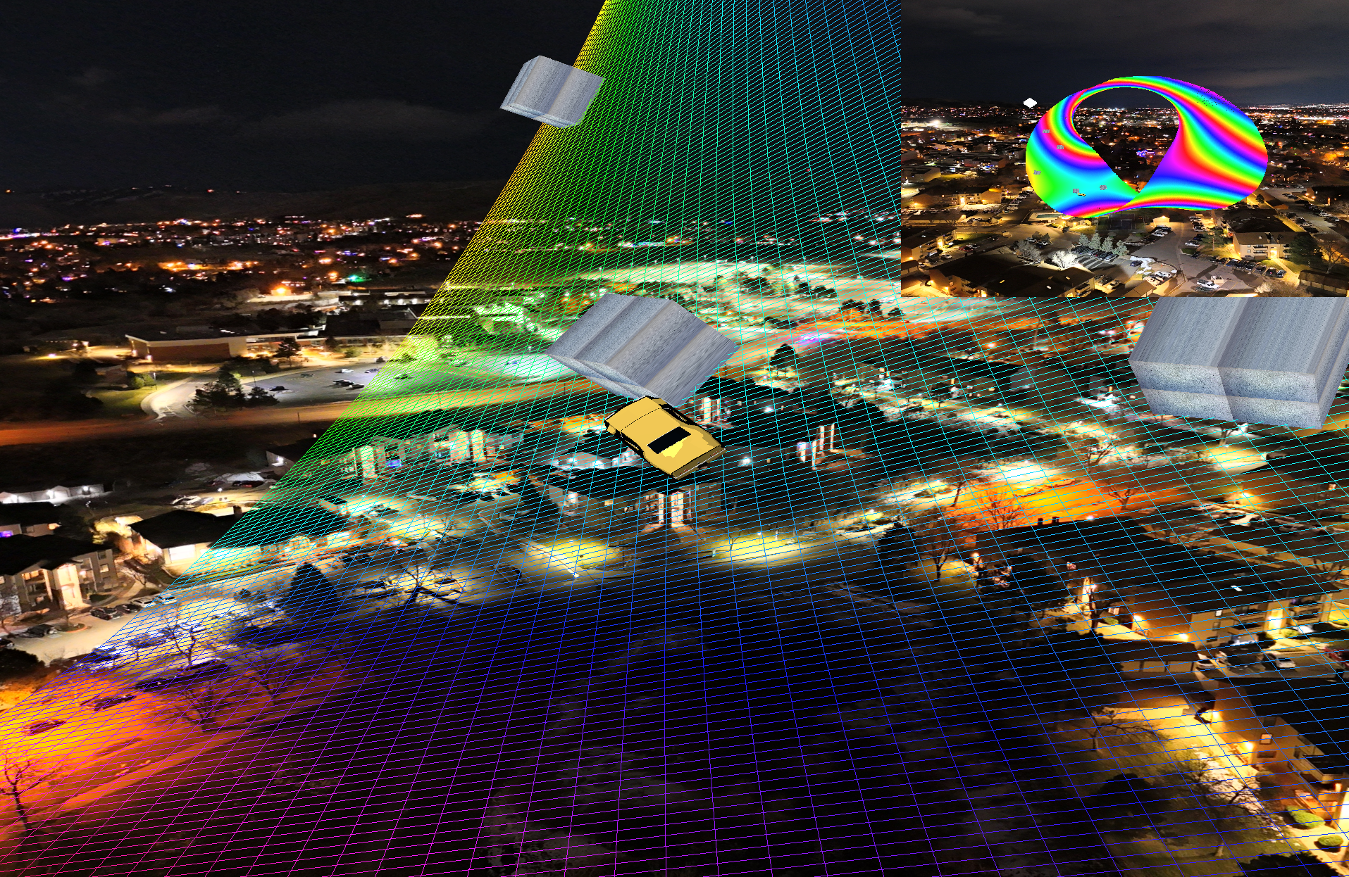 Esme IlossaL00 - This is an image of Esme's hometown, Zeppellen, created with the graphical library OpenGL and triangle-based primitives.