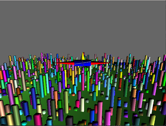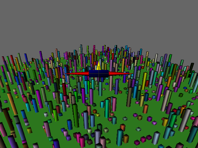 L02 - This is an introduction to the free camera model. Buildings are generated pseudorandomly. The user can "fly" through the buildings with the 'w' and 's' keys or change the flight direction by panning with the cursor.