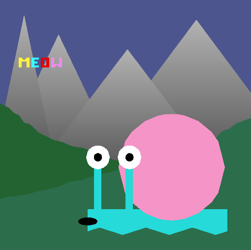A2 - Jarrison character This program consists of the drawing for Jarrison, drawn where he can traverse from area to area. Using the WASD or arrow keys, the user can move Jarrison across the screen whichever way they would like. His eyes are constantly clacking together. When the user clicks the left mouse button, Jarrison meows, and the "MEOW" text follows the cursor's location.