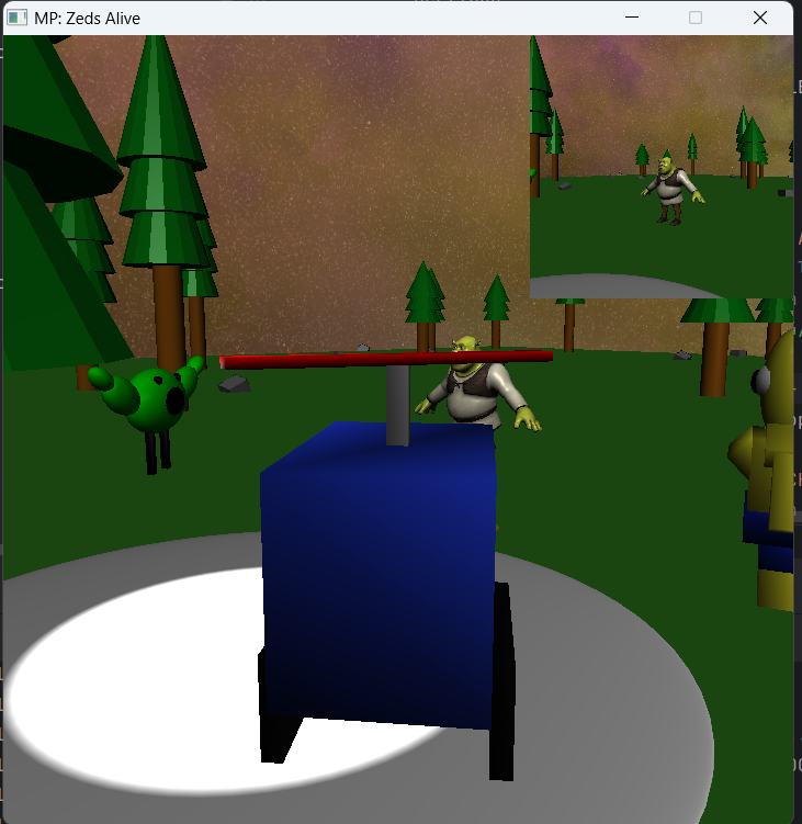 This is a screenshot of my Midterm Project! This is Jerry's vehicle and the heroes of my group members. They can all move around independently, and they each have their own arcball and first-person cameras! | |