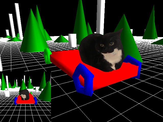 Now we get to the fun stuff: creating worlds and characters in 3D. In this program, you get to drive a Car around a 3D scene. The Car itself and all the objects making up the scene are taken from the class library, while the Cat is a .obj model taken from the models resource on the course webpage. You can use WASD to move the car, while 1-3 changes the view on the bottom-left. The views are first person, chase, and front. The main camera can also be moved by clicking and dragging the mouse, zooming in and out by holding shift. Does the cat look familiar to you? Well, it is none other than the famous Maxwell Cat! This Cat is fearless, and will keep on dancing, even if you start ramming into obstacles. Why is this possible? Because the Car is equipped with a Top Secret Experimental Sub-Atomic Accelerator that lets it phase through objects as if they were nothing! In all seriousness, it's because there isn't any collision detection. That will come later... Big Rigs, anyone?