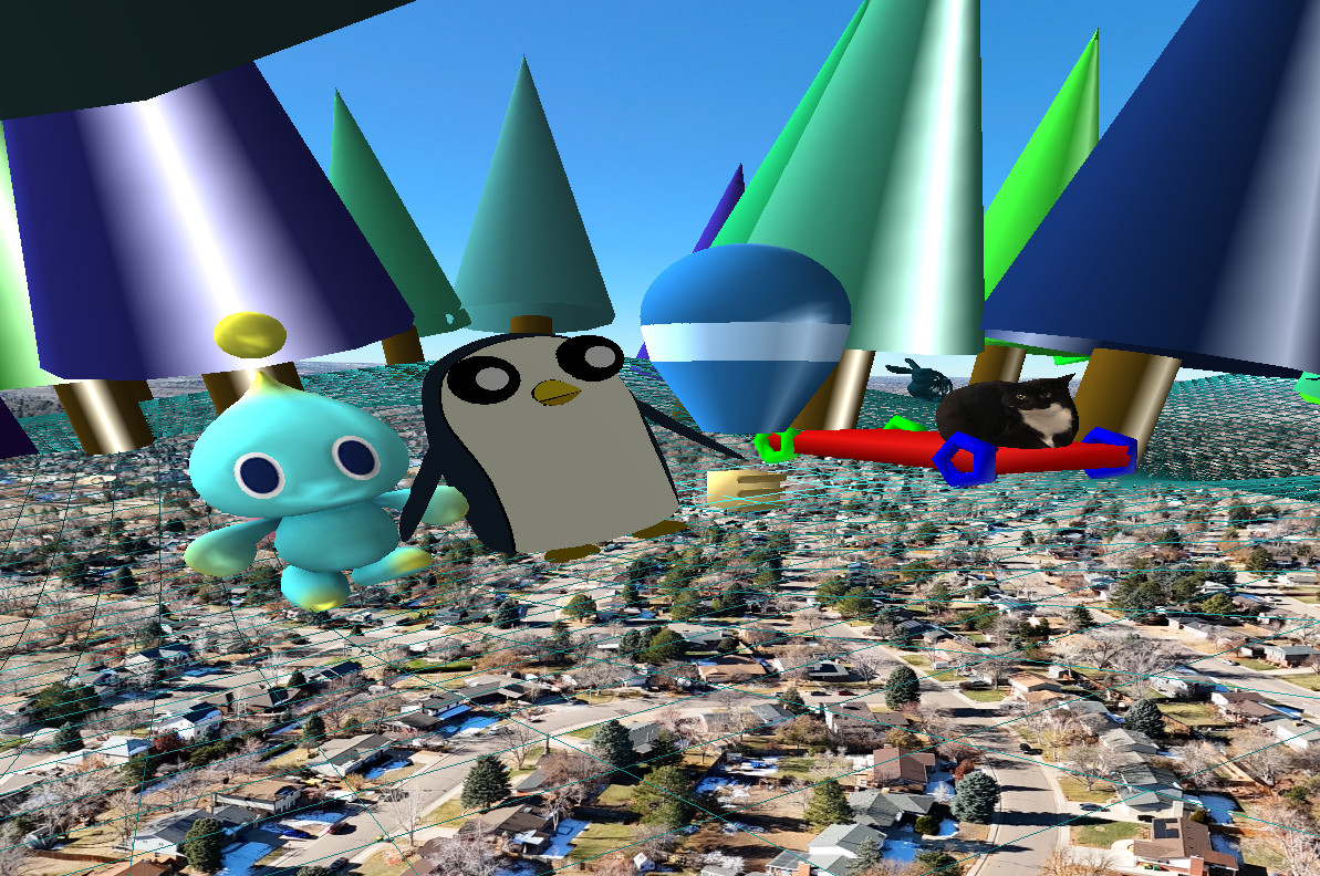 Building off the project shown above, I worked with three others to refine and combine all our characters into one program. This version comes with several new features. Such as simple character selection, freecam, and terrain elevation. Controls are mostly the same as the original product, except the number keys select the character and enters the freecam. The "skybox", or rather, skysphere, is a basic illusion. I captured the image early this year using a Mini 4 Pro, hovering about 380ft over Leawood Park. The way it's being rendered is pretty sneaky but simple. Instead of shoving the entire scene in a massive sphere (which honestly looks weird), I'm projecting the image on a sphere with a diameter of 3. The sphere itself is locked to the camera's position, and drawn before everything else with the depth test off. I then re-enable the depth test, then draw the rest of the scene. The resulting image looks like everything is enclosed in a sphere. | |