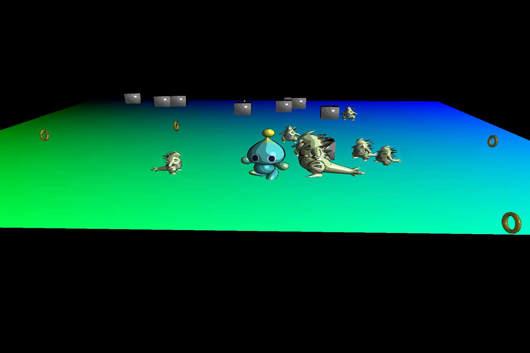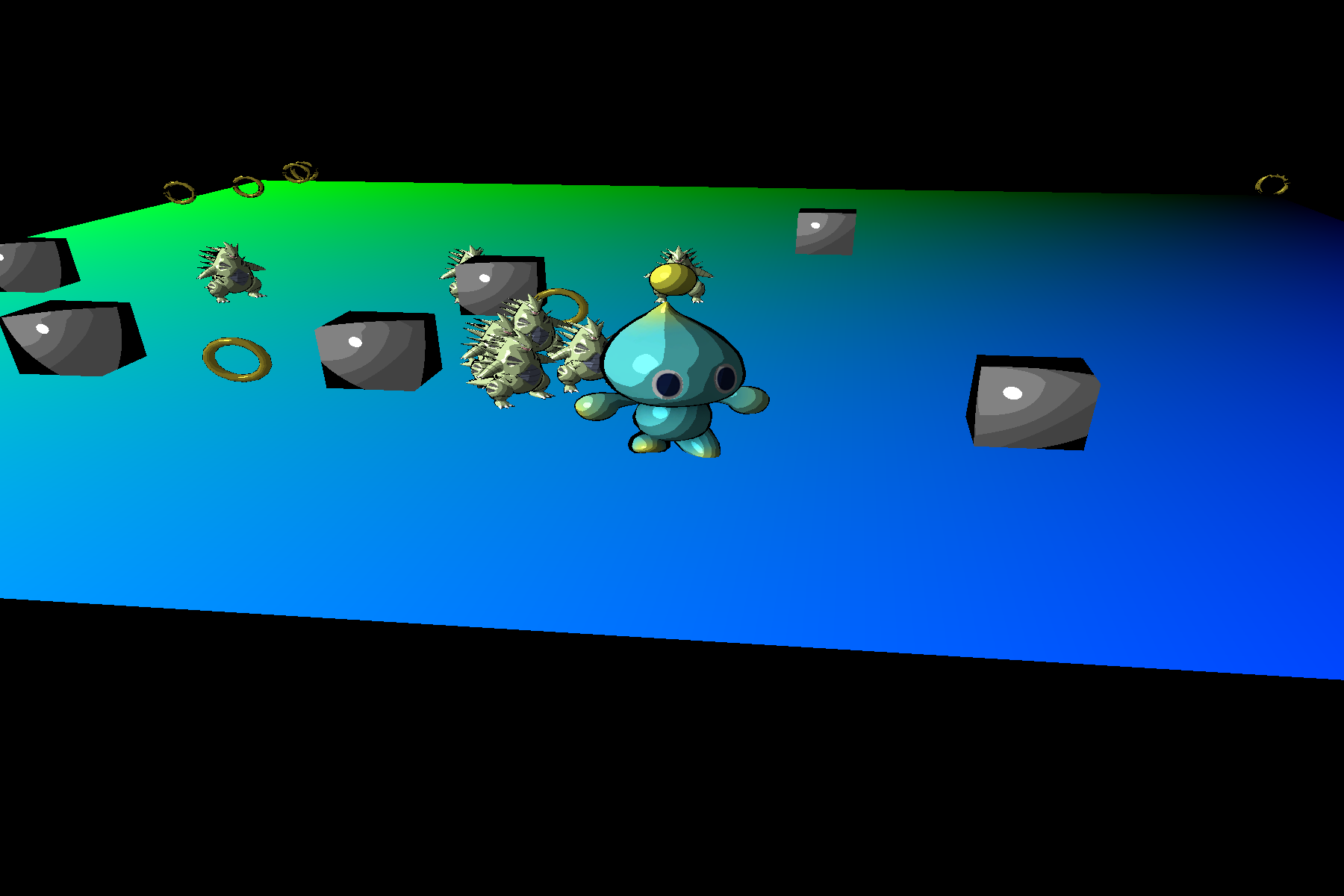These are pictures from our A3 assignment where we built a world to showcase a 3-D version of our "hero" (in my case a sonic chao!) and implement full phong illumination model utilizing gouraud shading. I am especially proud of this assignment as I had to load in each piece of my chao very meticulously so that I could animate the head, arms, and feet as the user moves him around the world. I also implemented some fun features through the shaders like being able to change the color of the chao (which normally the color comes from a texture) and the animated "stars" looking like they glow. The "stars" aren't given justice through these pictures but they are essentially 4 seperate solid cubes with 3 of them rotating about each axis so that they make a cool "star" shape, but then animate back to a cube again.