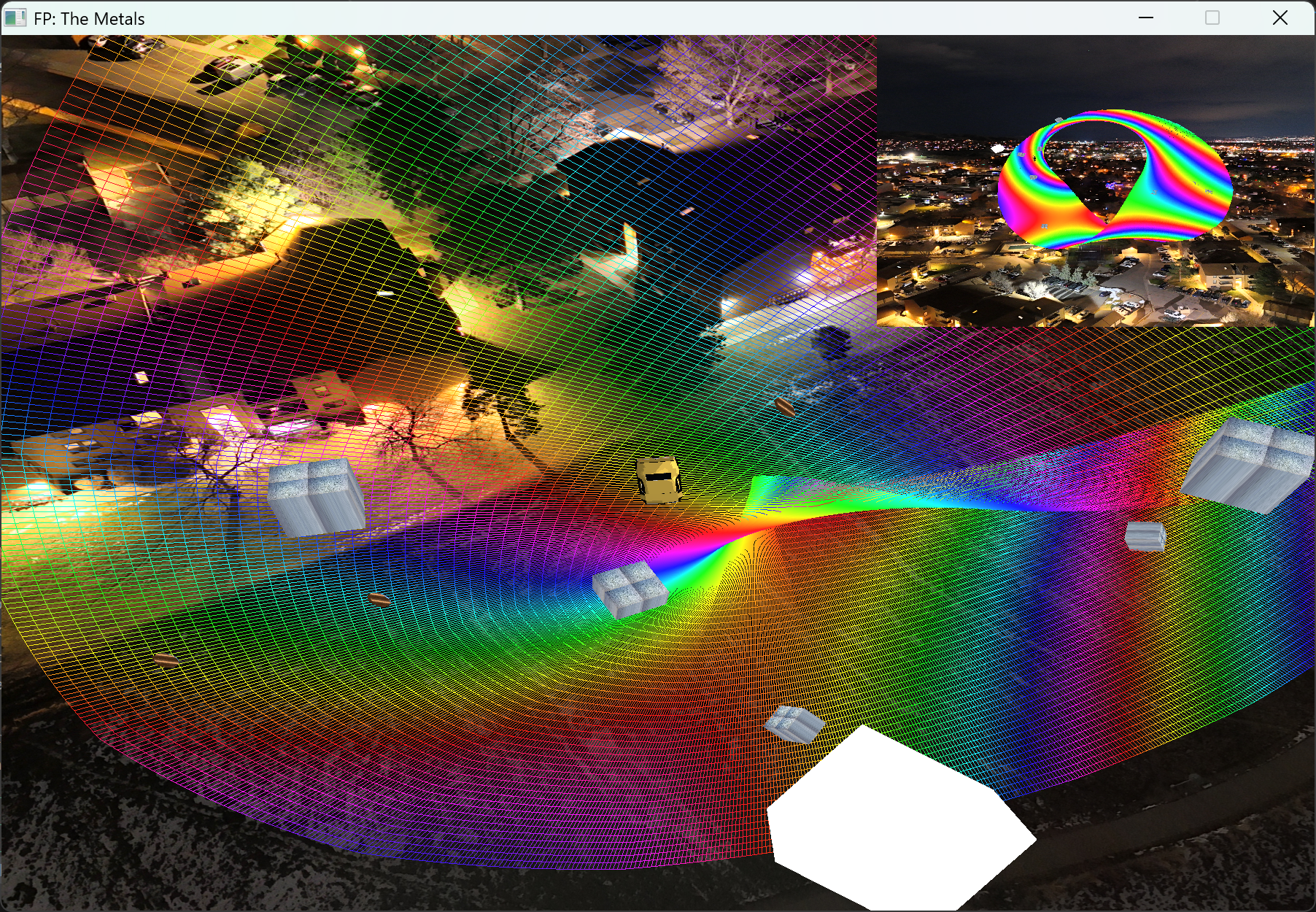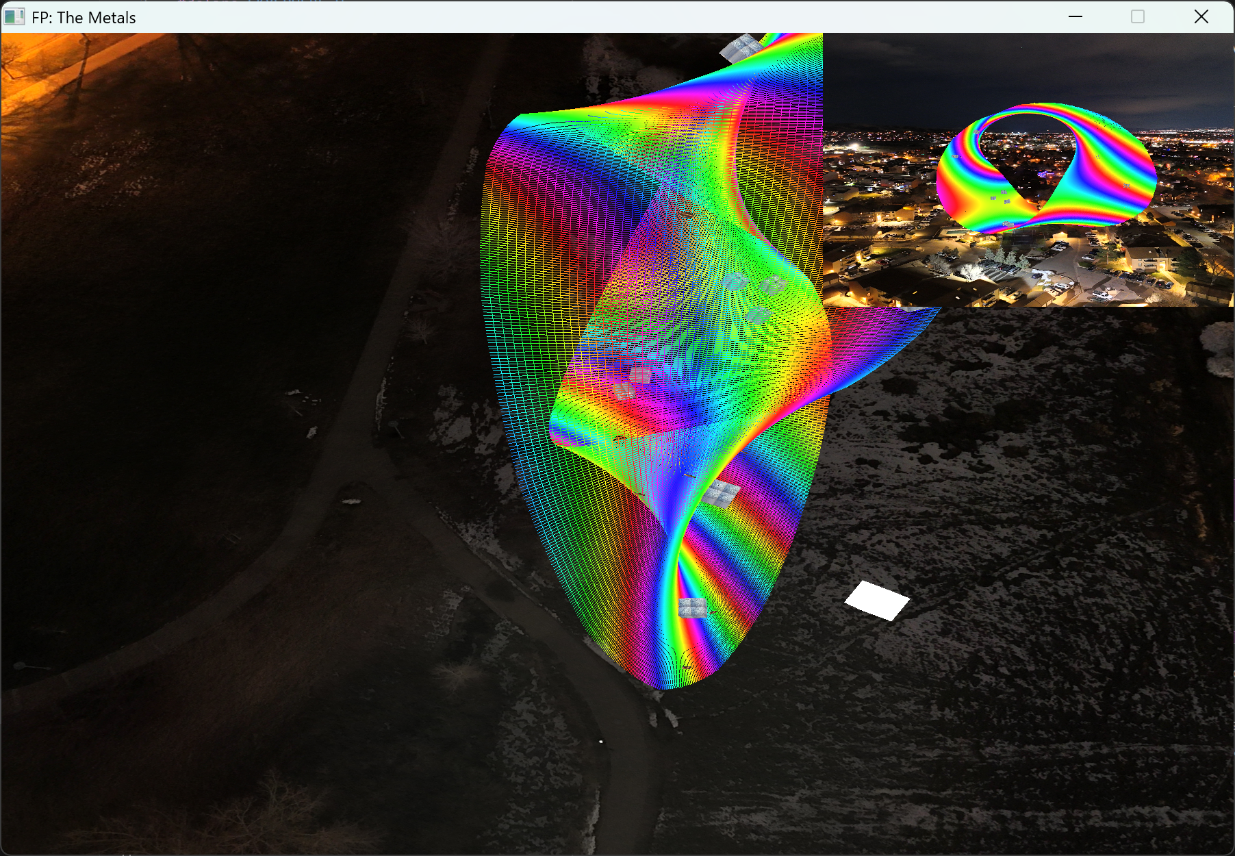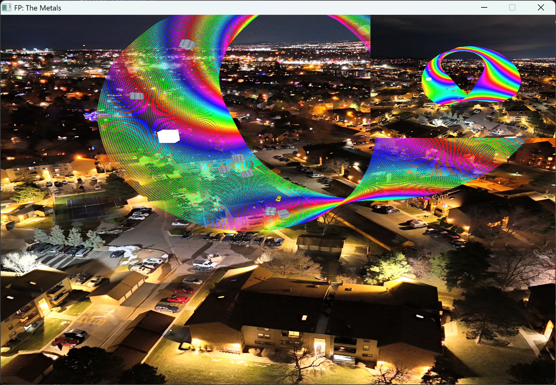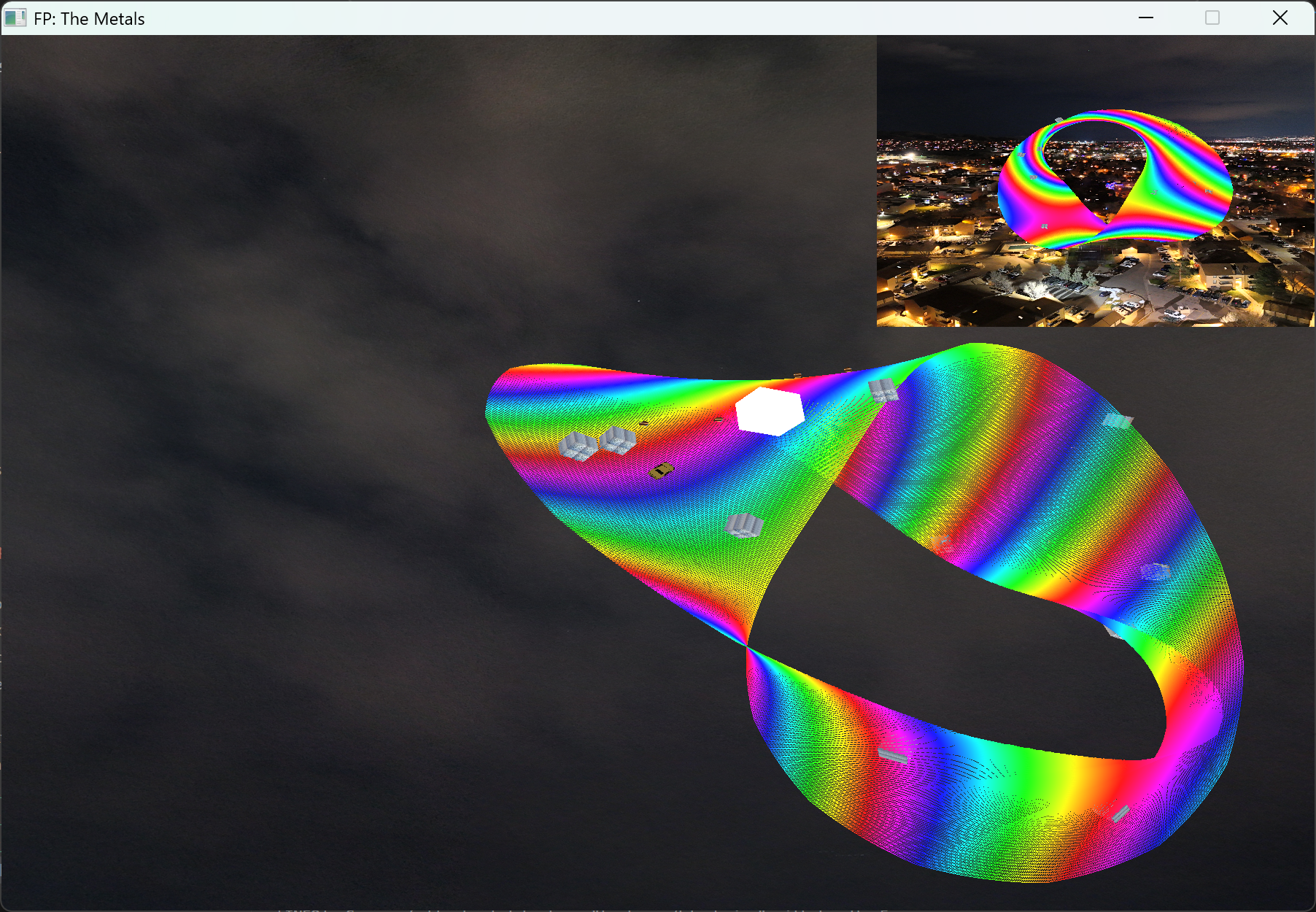 These are pictures from our A4 assignment where I was tasked to make a mini game. The game features an enemy particle system of the pokemon Tyranitar, coins to collect, and moving obstacle blocks while the player has 5 lives (getting hit by an enemy or falling off the map loses a life). I am especially proud of the toon shader that is incorporated into the game to give it a toon effect, the enemies all being Tyranitar and when they collide they combine into a larger Tyranitar and a new enemy Tyranitar spawns in (always 7 enemies in the game), and the coin system that spawns in 10 coins and waits for all of them to be collected before the next set is spawned in. These are screenshots from my group The Eternal Racers, final submission for the CSCI 441 final projgect. We are very proud of what it consists of as it has an artistic touch from each us who worked on it. I am especially proud of the rainbow road generated by using control points to generate a mobius strip via a tessellation shader. I am also proud of the point light light that follows just above the ground and follows a similar mobius curve. I am also proud of the toon shader that is present (also its kind of hard to see with the size of the car). Overall this project was a blast, I learned a lot, and I am super stoked with how it came out with my groups help. The program features a race car that is orientated to the mobius strip with third person camera so that you can drive around collecting coins. The goal of the "game" is to collect 10 coins as fast you can, but look out as if you hit one of those blocks hanging around, they will slow you down. | |