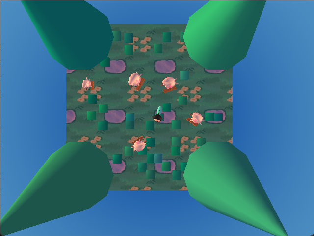 For this project I had to use particle systems with collision. The enemies are represented by a particle system that has collision between each particle. They also collide with the hero. The main objective is to make all enemies fall off the map, while not falling off 5 times yourself. Colliding causes both objects colliding to get sent perpendicular to the normal of their collision, which might not be the most intuitive for trying to bump people off the map, but it keeps them from ever getting stuck inside each other.